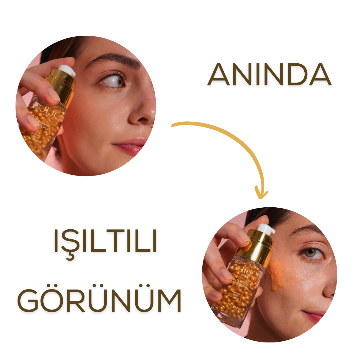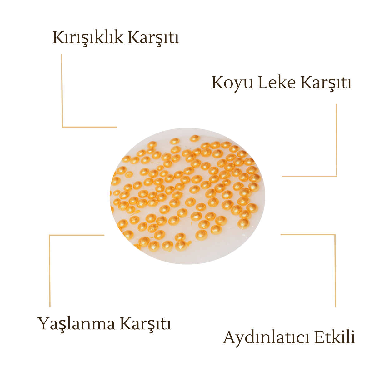 Yaşlanma ve Kırışıklık Karşıtı Altın Serumun içeriğindeki aktif bileşen yüklü tanecikler her kullanımda nemlendirici jelle karışarak taze bir ürün sunar. Tanecikler ve nemlendirici jel, her kullanımda anında bir araya gelerek cildin ışıltısını arttırmaya, yaşlılık belirtilerini önlemeye ve elastikiyetini kaybetmiş cansız cildin nem dengesini sağlamaya yardımcı olacak ürün kullanımını hazırlar. Yaşlanma ve Kırışıklık Karşıtı Altın Serum uygun bir cilt bakım rutini içerisinde ve düzenli kullanımla ince çizgilerin ve kırışıklıkların görünümünü azaltmaya; cildin ışıltılı ve aydınlık görünüm kazanmasına yardımcı olabilir. Dermatolojik olarak test edilmiştir.