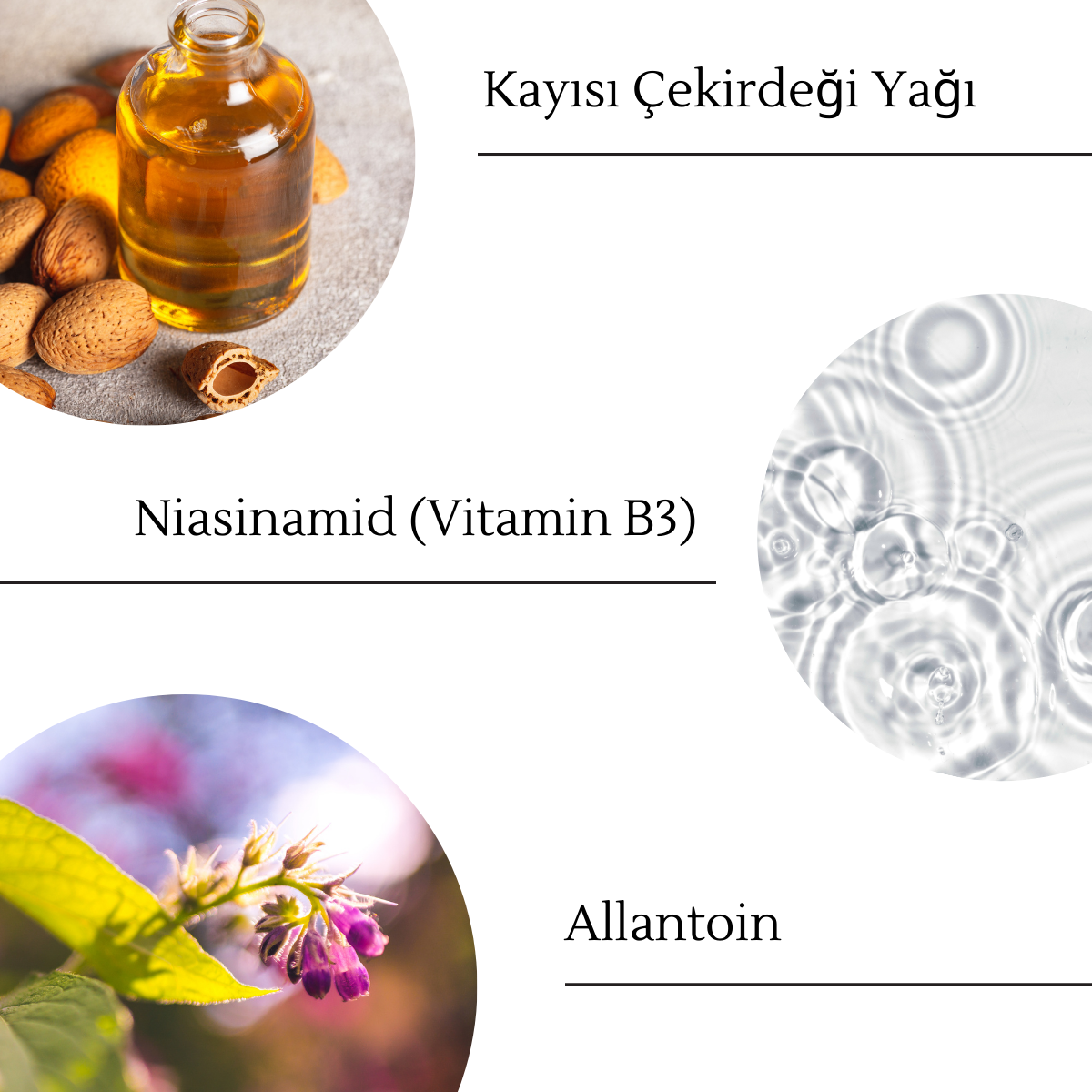 - Kayısı Çekirdeği Yağı ve Jojoba Yağları; cildin kolajen ihtiyacını karşılayarak elastikiyetini korumasına yardım eder. İyi bir antioksidandır ve derinlemesine nemlendirir. Cildin beslenmesine yardımcı olur.