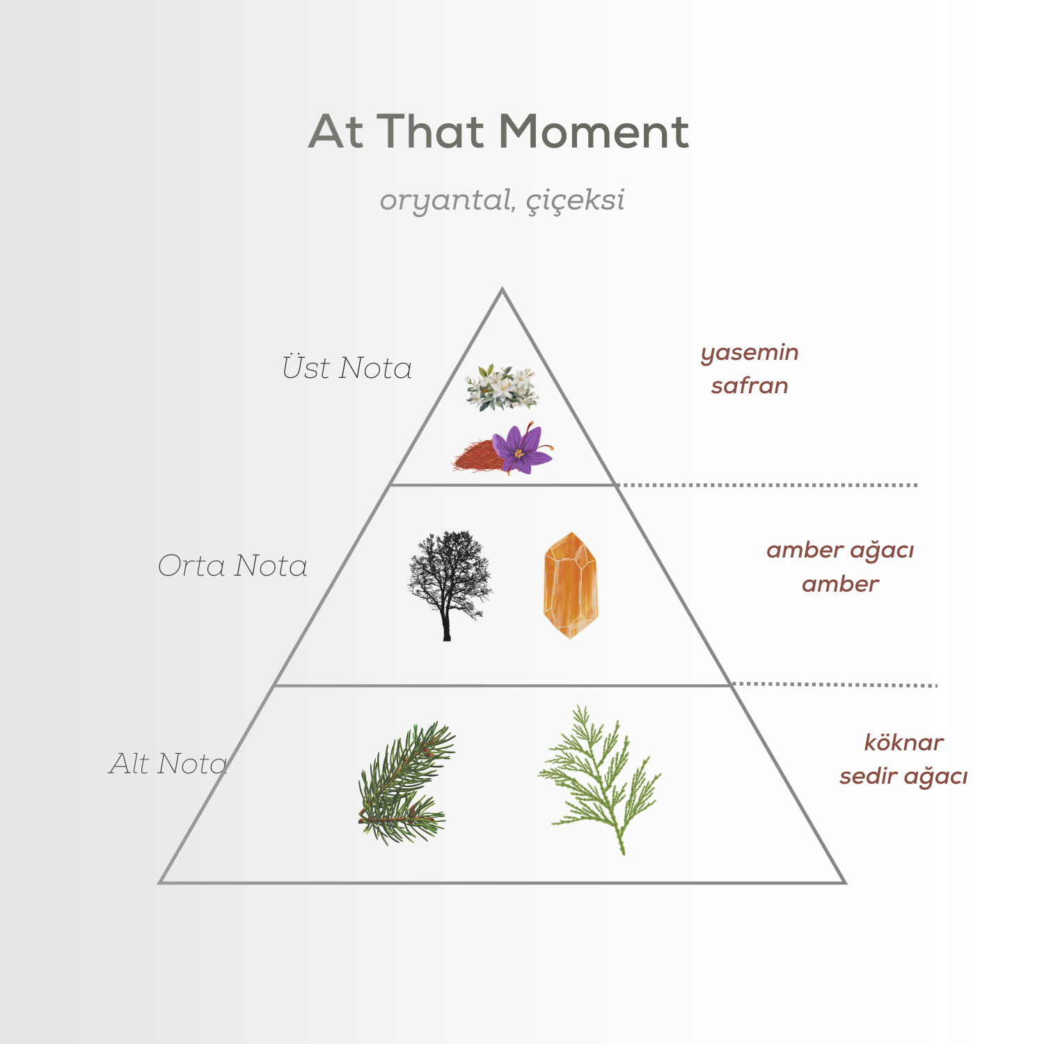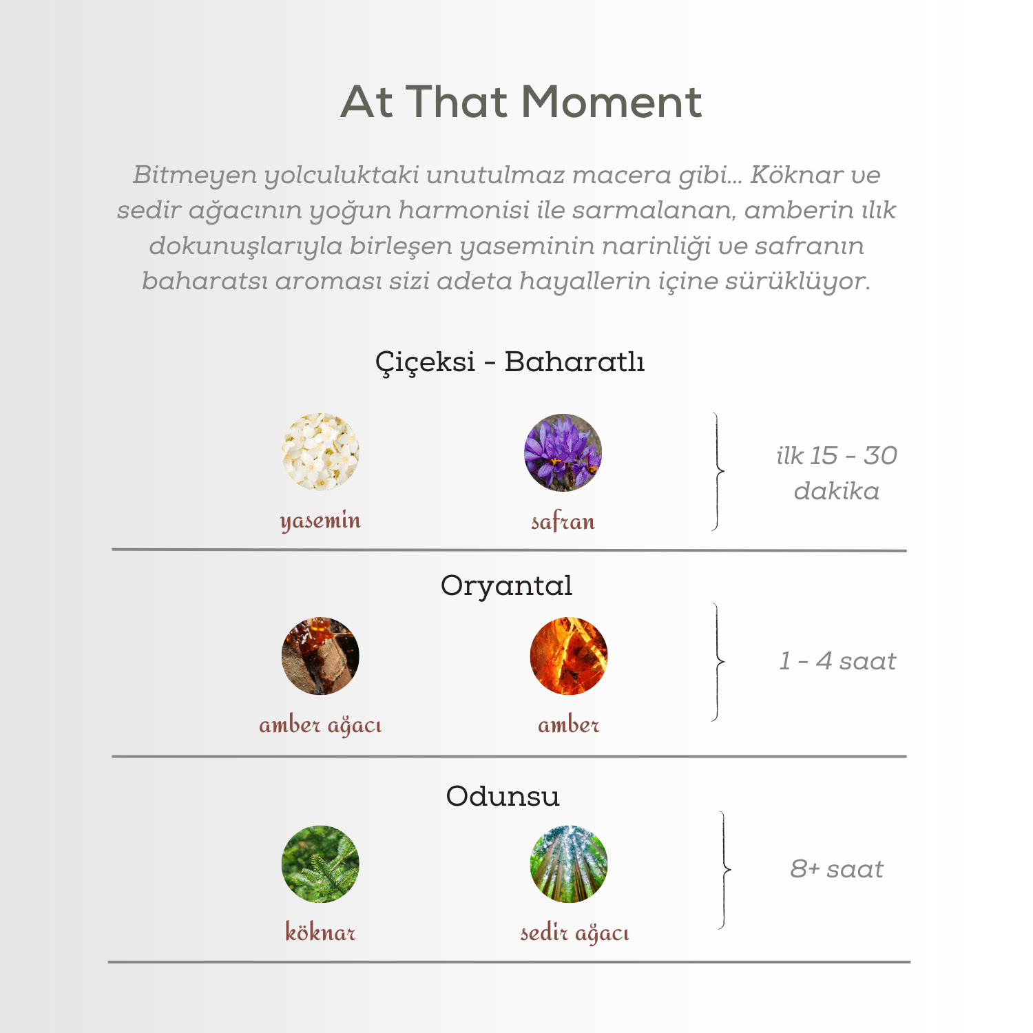 At That Moment, köknar ve sedir ağacının yoğun harmonisi ile sarmalanan, amberin ılık dokunuşlarıyla birleşen yaseminin narinliği ve safranın baharatsı aroması sizi adeta hayallerin içine sürüklüyor.Yasemin ve Safran'ın ışıltılı dansı ile açılış yapan At That Moment Kadın Parfüm EDP 100 ml, bu güzel dansı orta nolarında Kehribar ağacı ve Amber vurucu zarafeti ile sürdürüyor. Temel notalarındaki köknar ve sedir ağacının narin ve ipeksi teninizde muhteşem bir harmoniye dönüşüyor.