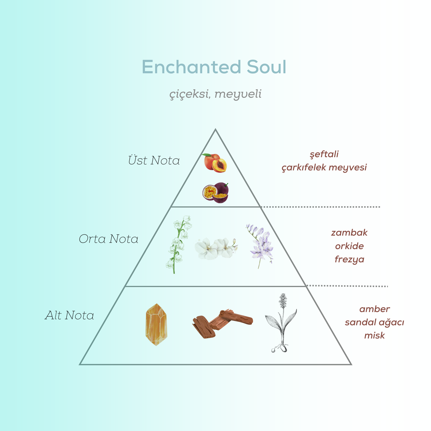 Enchanted Soul Erkek Parfüm EDP 100 Ml şeftali ve çarkıfelek meyvelerinin ışıltısı ile açılış yaparken, orta nolarında zambak, orkide ve frezyanın etkileyici harmonisiyle tende yükseliyor. Temel notalarındaki sandal ağacı, amber, ve miskin büyüleyici karışımı zarafeti en üst noktaya taşıyor.